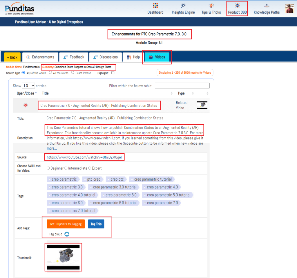Punditas AI Advisor also offers Video Tutorials for every enhancement to help Users learn how to use the feature in Creo Parametric software. The image below shows the related videos for “Fundamentals” that has been updated in Creo 7.0.3.0 These Videos are extracted and curated by Punditas AI engine from 10’s of repositories including PTC’s Learning Connector, YouTube, Vimeo, etc.