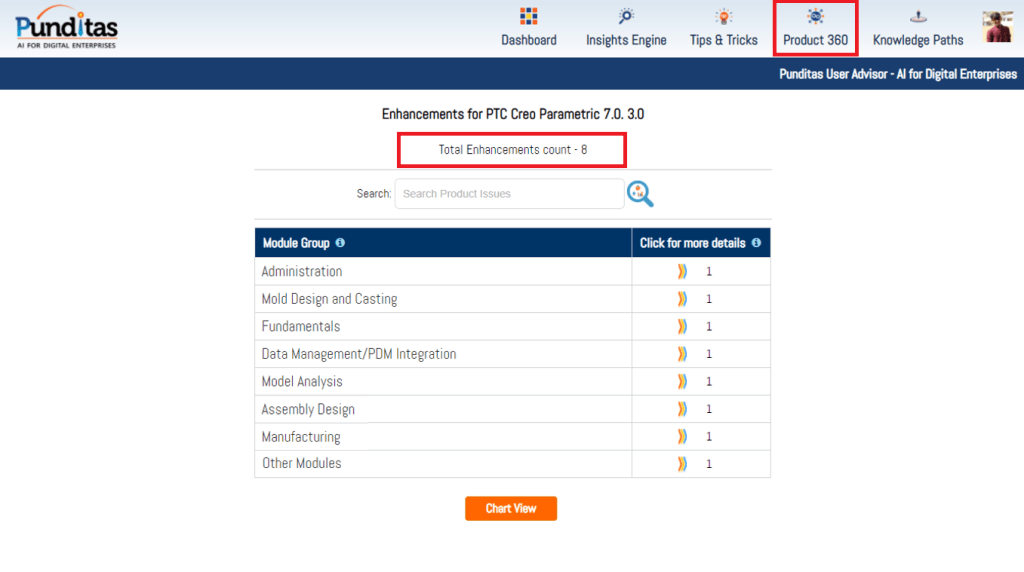 PTC released Creo 7.0.3.0 recently. Punditas AI Advisor now supports this latest version of Creo 7.0.3.0 . Punditas AI allows users to learn more about “How”, What” and “Why” of these enhancements through Product 360 module. The picture below shows the Module groups and the corresponding enhancements added within each group. To try this out, please signup for a FREE trial at Punditas AI