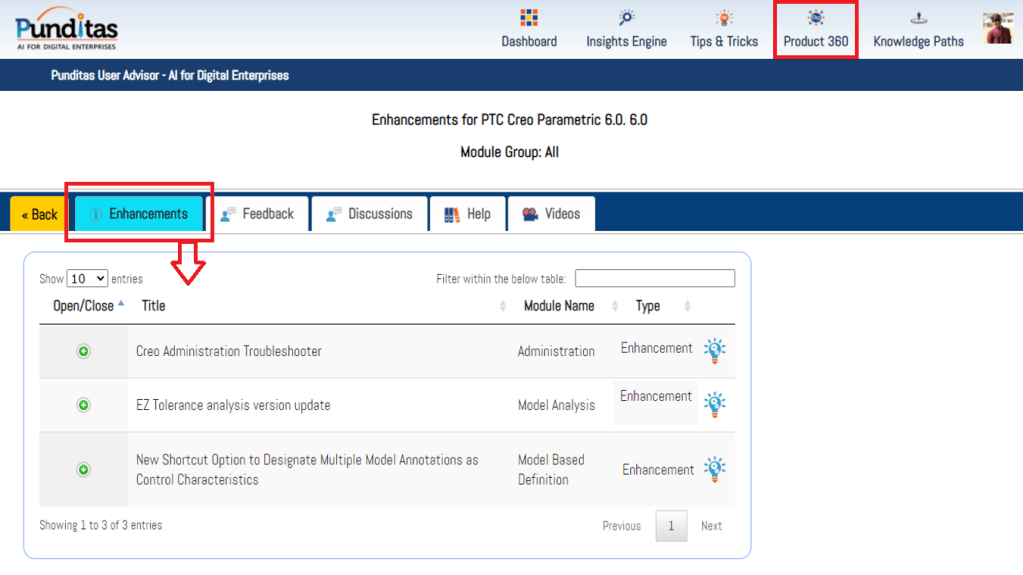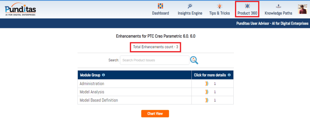 PTC released Creo 6.0.6.0 recently. Punditas AI Advisor now supports this latest version of Creo 6.0.6.0. Punditas AI allows users to learn more about “How”, What” and “Why” of these enhancements through Product 360 module. The picture below shows the Module groups and the corresponding enhancements added within each group. To try this out, please signup for a FREE trial at Punditas AI