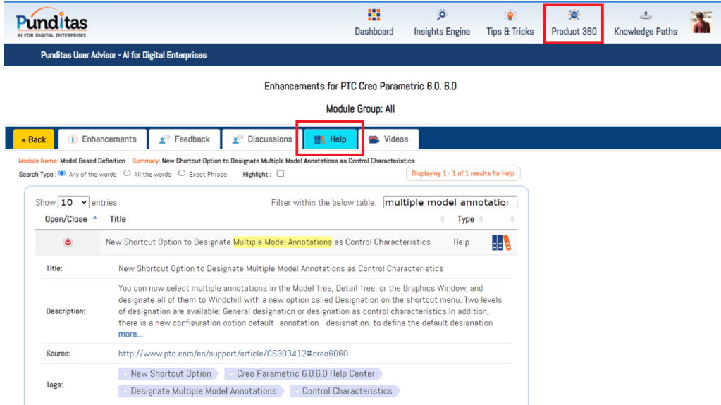 Punditas AI Advisor displays Help documentation for every enhancement as described by PTC in their Online Help. The image below shows Help articles that are relevant to “Model based definition” enhancement added to Creo 6.0.6.0