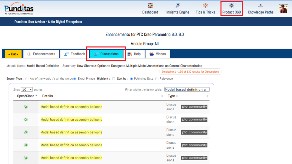 Punditas AI Advisor is a powerful platform as Users can access a single source of community chatter (discussions, opinions, suggestions) from both PTC and non-PTC sources. The image below shows discussions from PTC community related to “Model based definition” enhancement in Creo 6.0.6.0