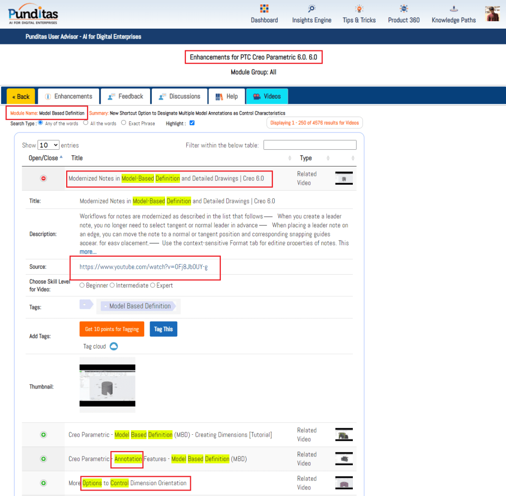 Punditas AI Advisor also offers Video Tutorials for every enhancement to help Users learn how to use the feature in Creo Parametric software. The image below shows the related videos for “Model based definition” that has been updated in Creo 6.0.6.0. These Videos are extracted and curated by Punditas AI engine from 10’s of repositories including PTC’s Learning Connector, YouTube, Vimeo, etc.