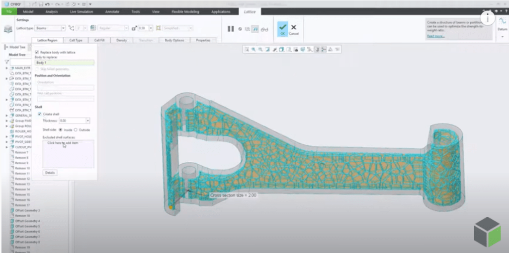 PTC introduced Stochastic lattices (random lattices) in Creo Parametric 6.0. This first implementation of the stochastic lattices used Voronoi diagram algorithm. Voronoi is a common algorithm when you want a lattice to conform to bionic shapes.