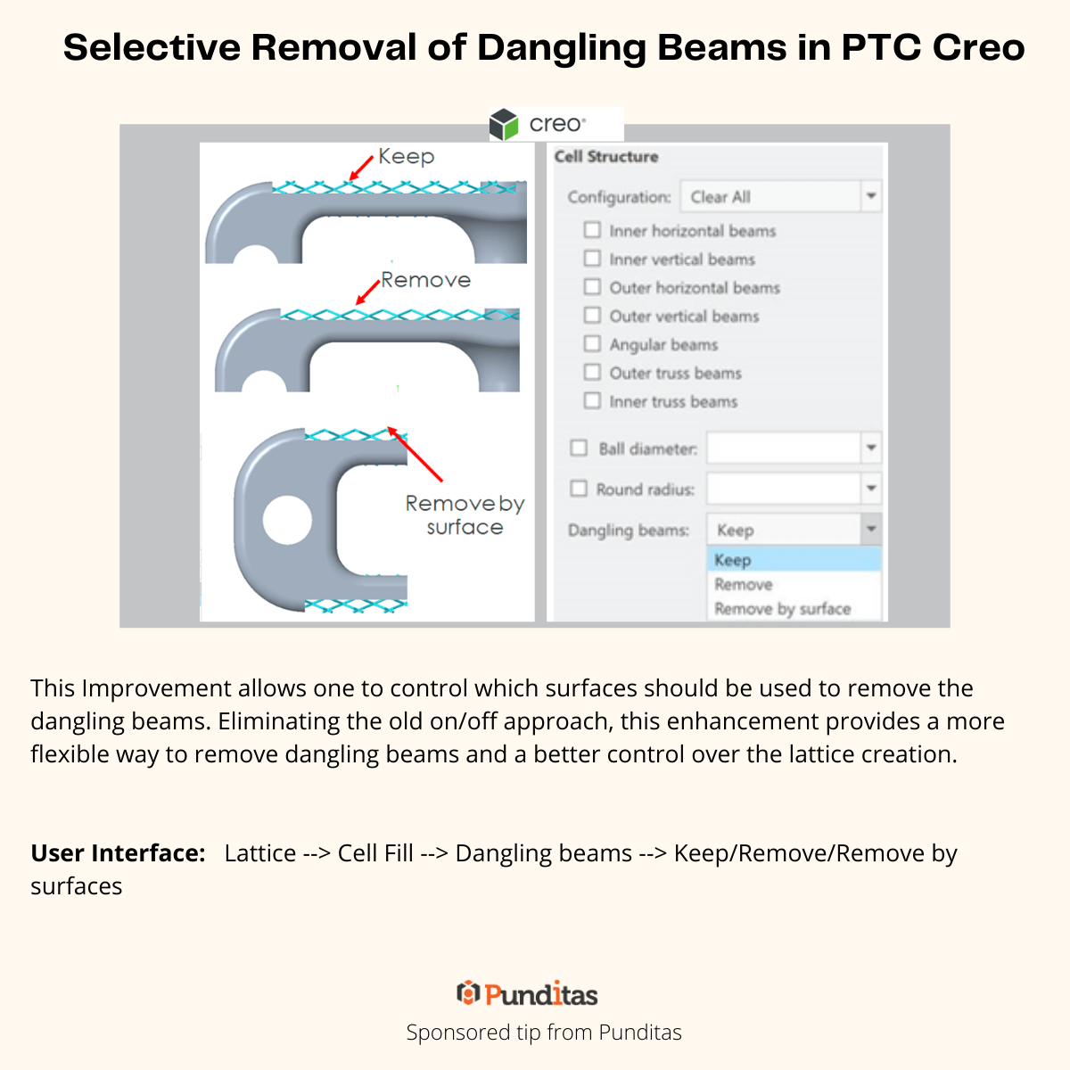 User Interface: Lattice –> Cell Fill –> Dangling beams –> Keep/Remove/Remove by surfaces