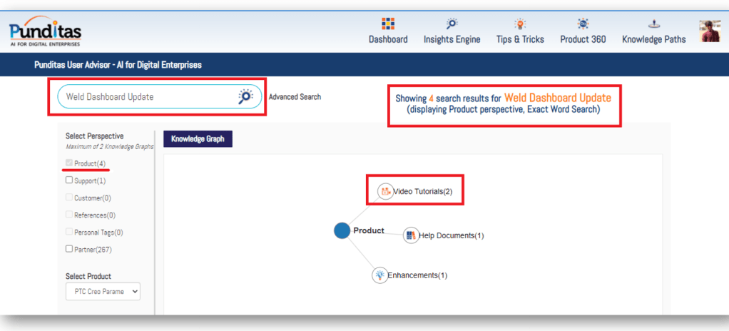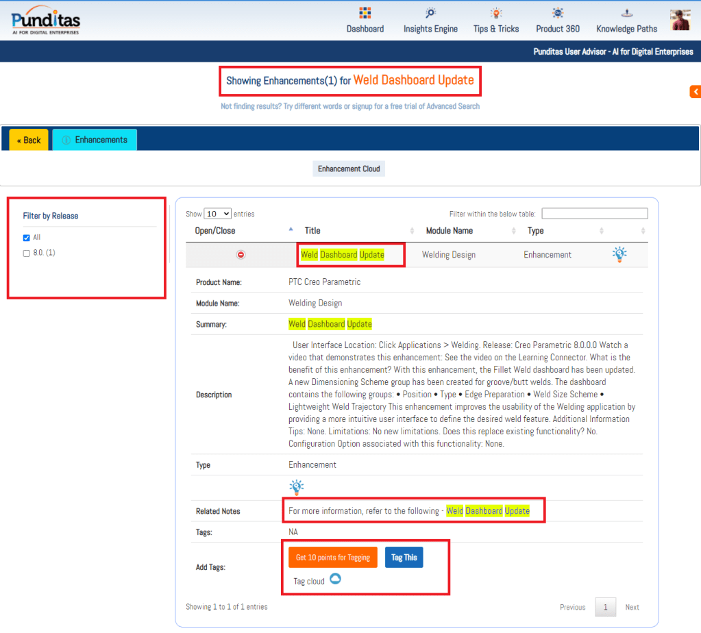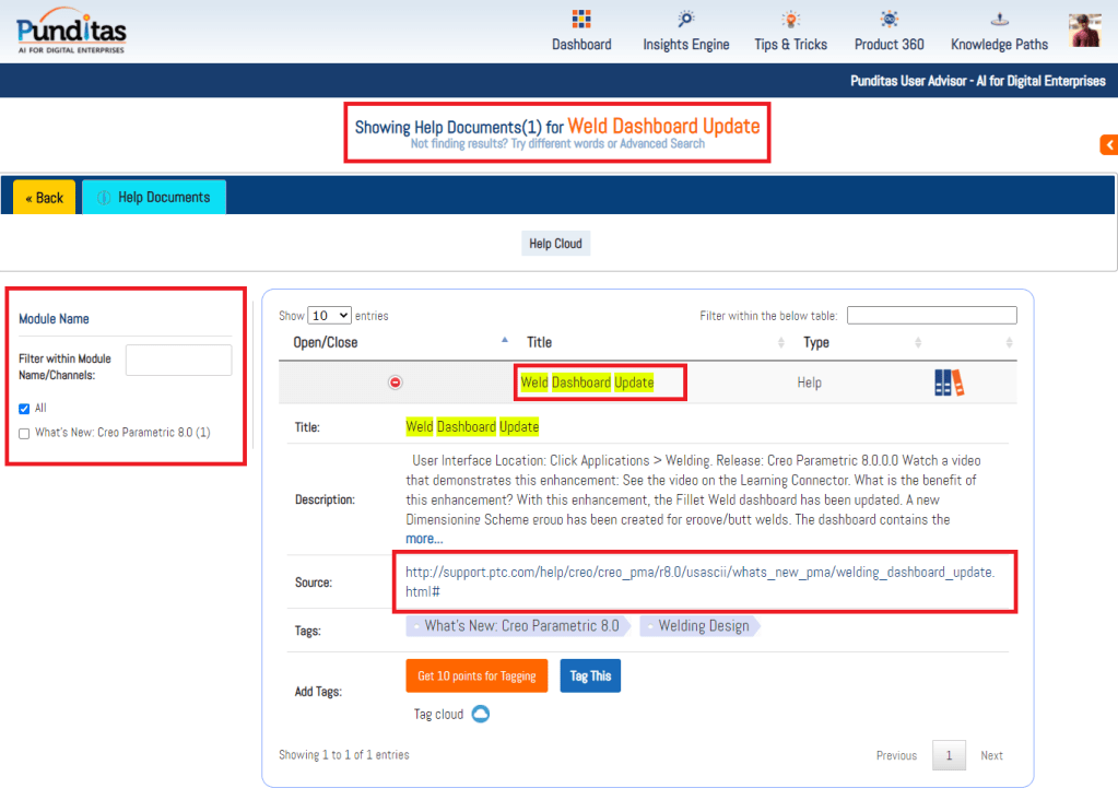 Punditas AI Advisor provides real-time guidance as you work in the Creo environment. Information on “how to use” a feature in Creo or best practices for working with Creo are presented within context, removing the need to guess or search for such information. Punditas AI driven content helps you leverage Creo to create your designs faster and with confidence. For example searching for “weld dashboard” in Punditas AI displays the following results –