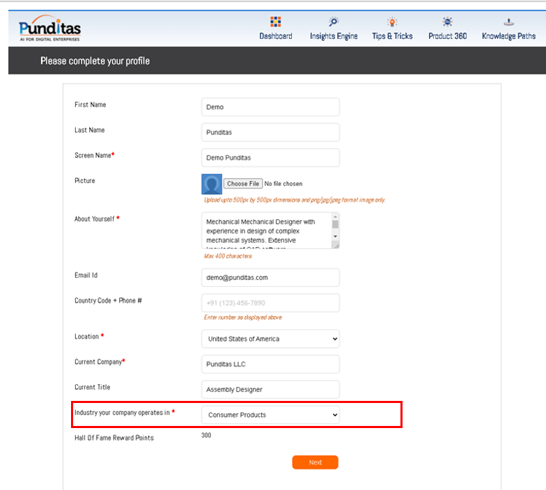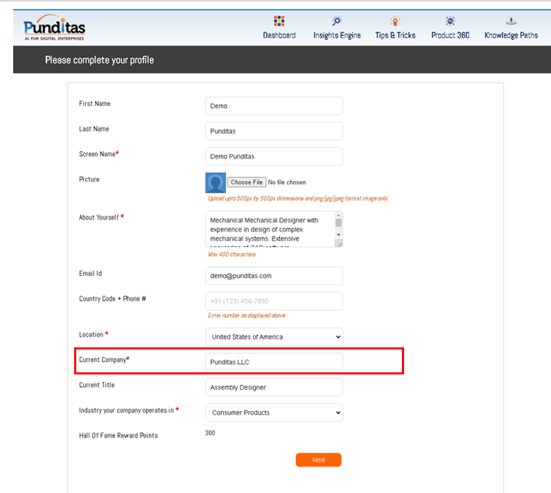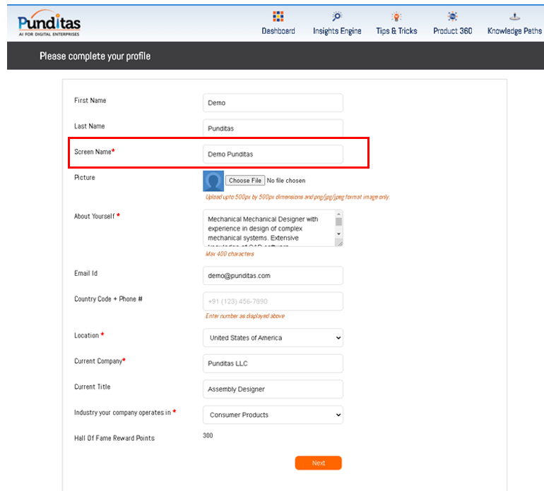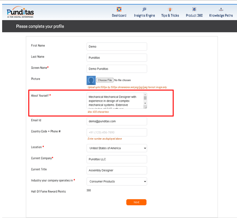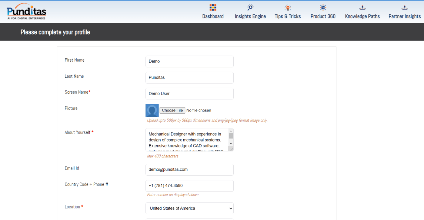 Step 3: If you are logging into Punditas AI for the first time, you will see the below page to complete your profile.