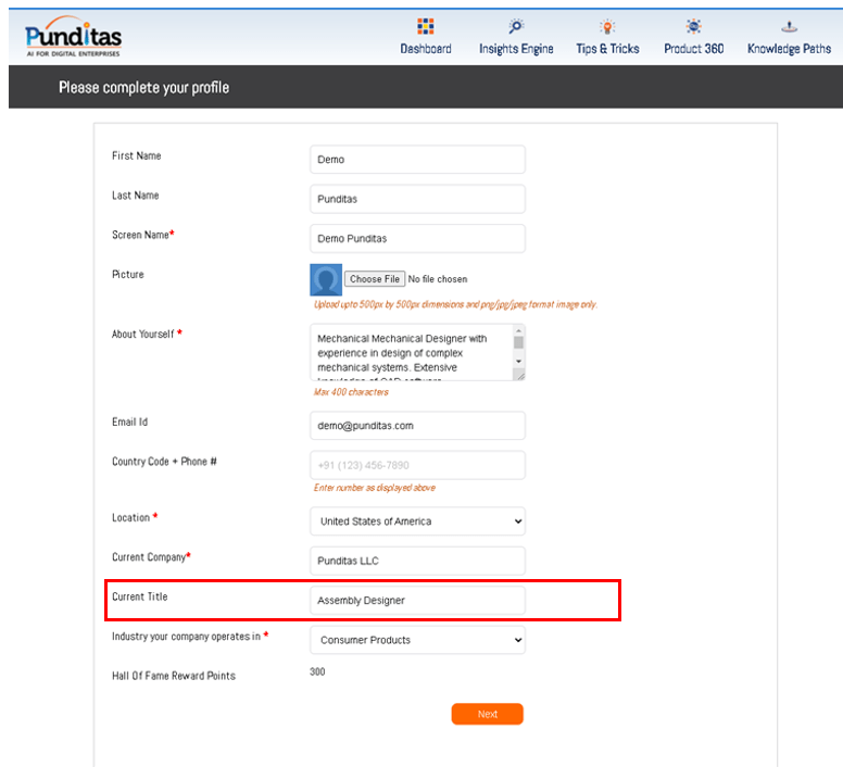 Step 12: Current Tile: This is an optional field. However, its highly recommended that you capture your current title to enable Punditas AI engine to learn and display content that’s pertinent to you