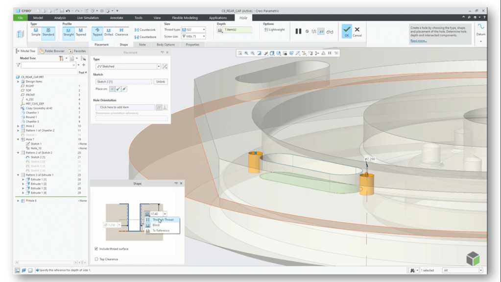 Starting with Creo 8.0, the Hole feature provides enriched thread handling options for thread length and intersection control. You use the following thread depth control options for additional flexibility :