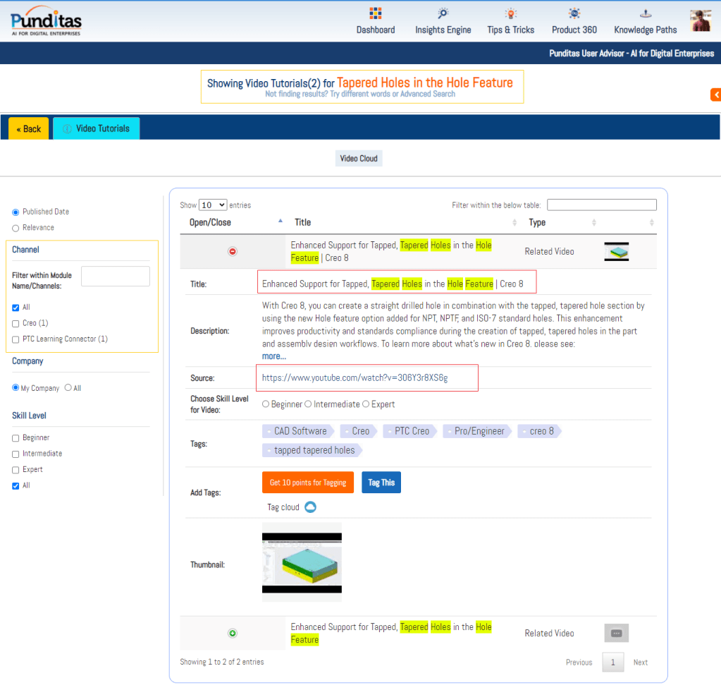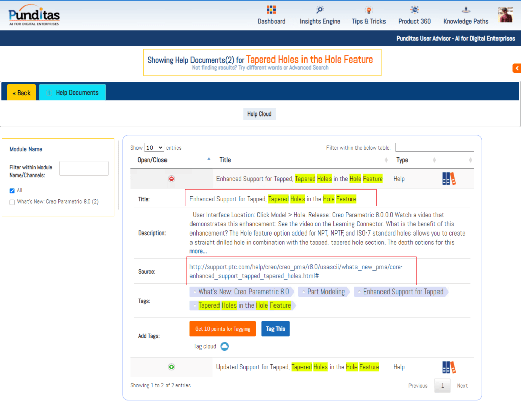 Punditas AI Advisor provides real-time guidance as you work in the Creo environment. Information on “how to use” a feature in Creo or best practices for working with Creo are presented within context, removing the need to guess or search for such information. Punditas AI driven content helps you leverage Creo to create your designs faster and with confidence. For example searching for “weld dashboard” in Punditas AI displays the following results –
