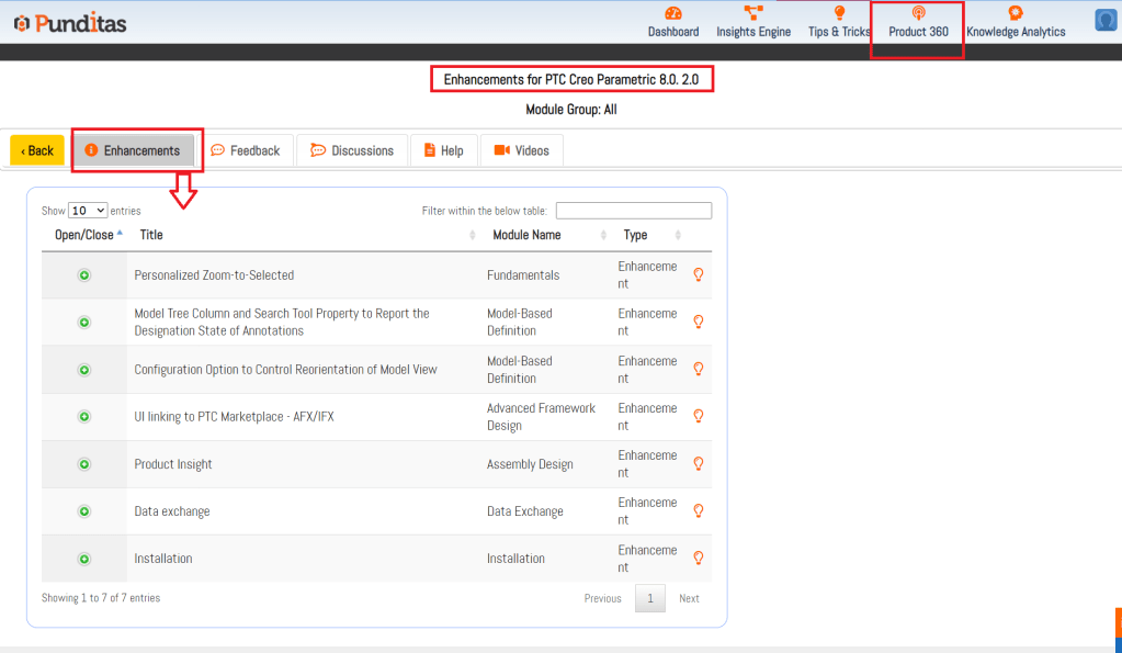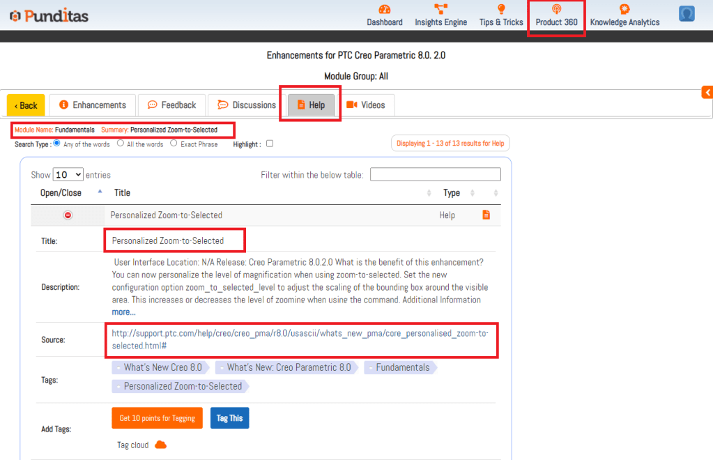 The Detailed View option in Punditas AI allows Creo Users to explore each enhancement in greater detail. The picture below shows the details of every enhancement in Creo 8.0.2.0. Not only is the list of enhancements displayed but also the associated Video tutorials, Online Help documentation (provided by PTC) as well as community discussions around this topic