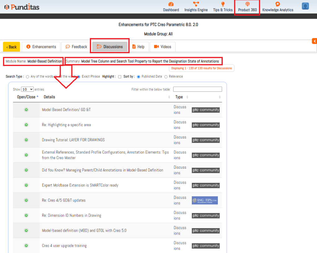 Punditas AI Advisor is a powerful platform as Users can access a single source of community chatter (discussions, opinions, suggestions) from both PTC and non-PTC sources. The image below shows discussions from PTC community related to “Model-Based Definition” enhancement in Creo 8.0.2.0