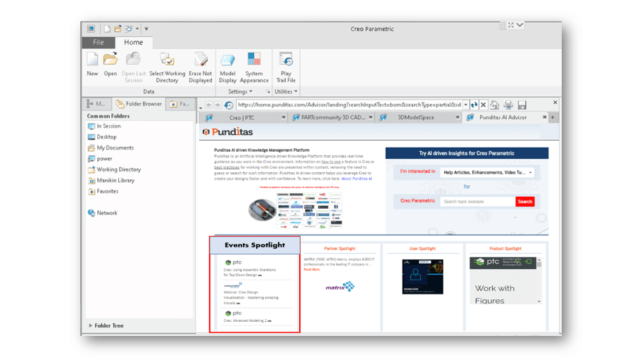 Punditas AI is embedded within Creo. The AI technology within Punditas automatically discovers Training and other events and presents them within Creo. With this, Creo training is only a click away for PTC users world-wide. Companies that offer Training around PTC Creo can contact Punditas to promote their events directly to Creo users.