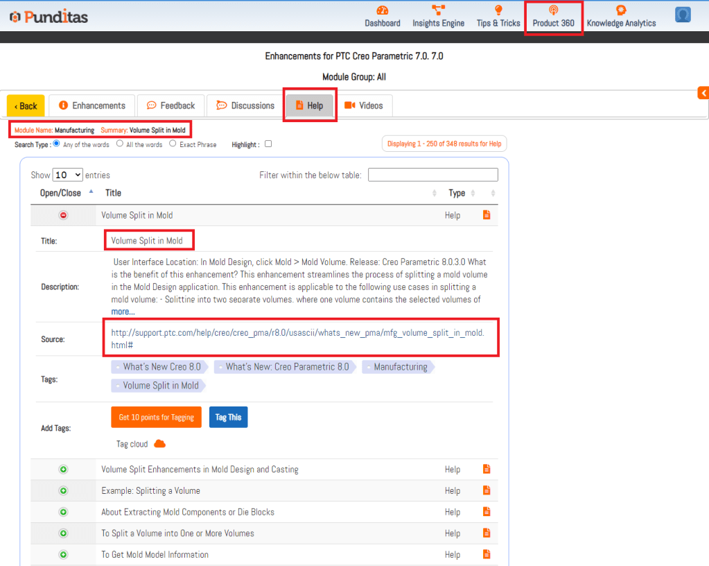 The Detailed View option in Punditas AI allows Creo Users to explore each enhancement in greater detail. The picture below shows the details of every enhancement in Creo 7.0.7.0. Not only is the list of enhancements displayed but also the associated Video tutorials, Online Help documentation (provided by PTC) as well as community discussions around this topic.