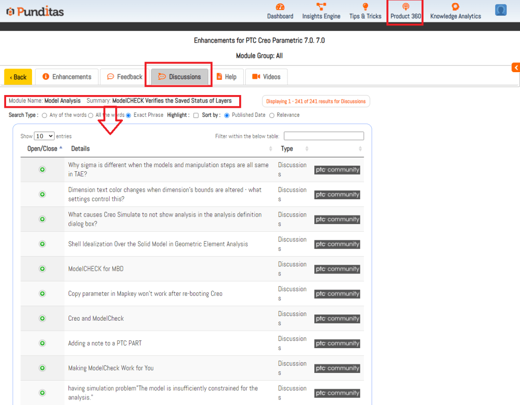 Punditas AI Advisor is a powerful platform as Users can access a single source of community chatter (discussions, opinions, suggestions) from both PTC and non-PTC sources. The image below shows discussions from PTC community related to “Model Analysis” enhancement in Creo 7.0.7.0