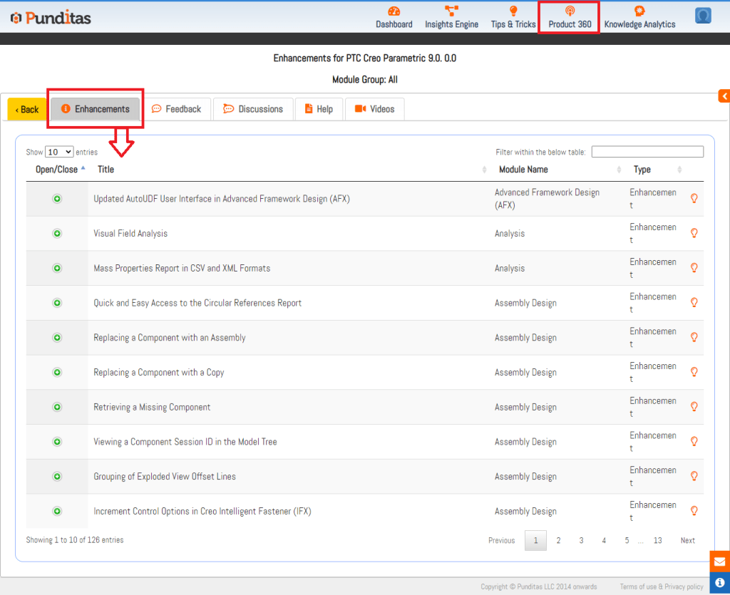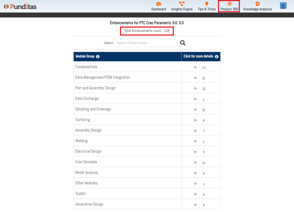 PTC released Creo 9.0.0.0 recently. Punditas AI Advisor now supports this latest version of Creo 9.0.0.0 . Punditas AI allows users to learn more about “How”, What” and “Why” of these enhancements through Product 360 module. The picture below shows the Module groups and the corresponding enhancements added within each group. To try this out, please signup for a FREE trial at Punditas AI