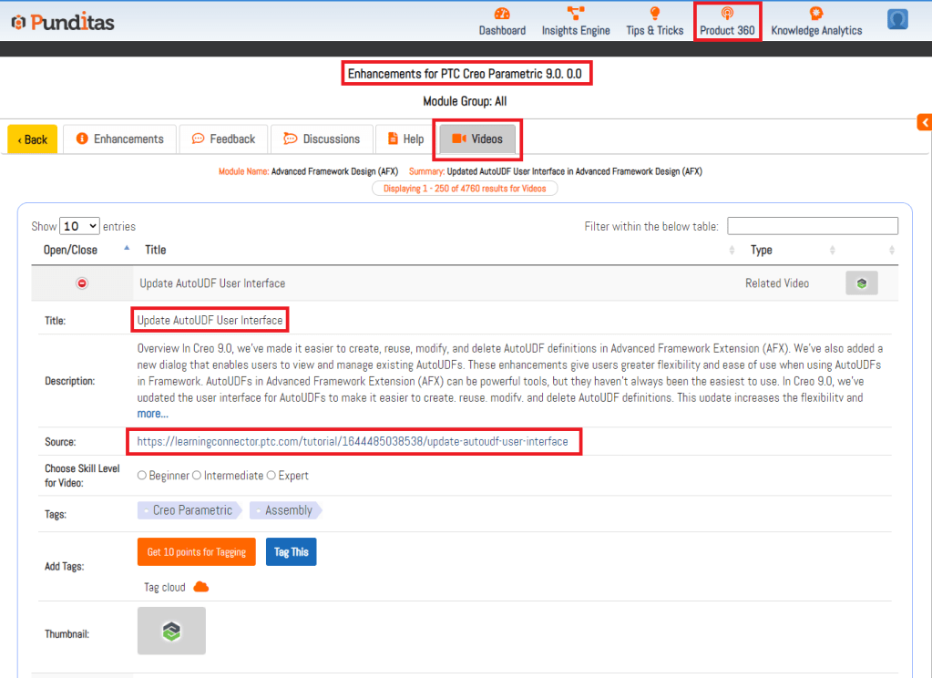 Punditas AI Advisor also offers Video Tutorials for every enhancement to help Users learn how to use the feature in Creo Parametric software. The image below shows the related videos for “Advanced Framework Design (AFX)” that has been updated in Creo 9.0.0.0 These Videos are extracted and curated by Punditas AI engine from 10’s of repositories including PTC’s Learning Connector, YouTube, Vimeo, etc.