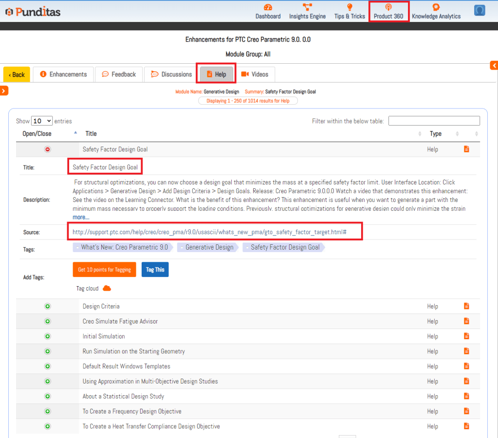 Punditas AI Advisor displays Help documentation for every enhancement as described by PTC in their Online Help. The image below shows Help articles that are relevant to “Generative Design” enhancement added to Creo 9.0.0.0