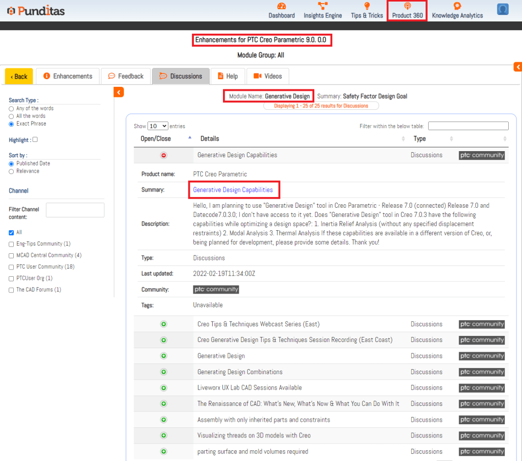 Punditas AI Advisor is a powerful platform as Users can access a single source of community chatter (discussions, opinions, suggestions) from both PTC and non-PTC sources. The image below shows discussions from PTC community related to “Generative Design” enhancement in Creo 9.0.0.0