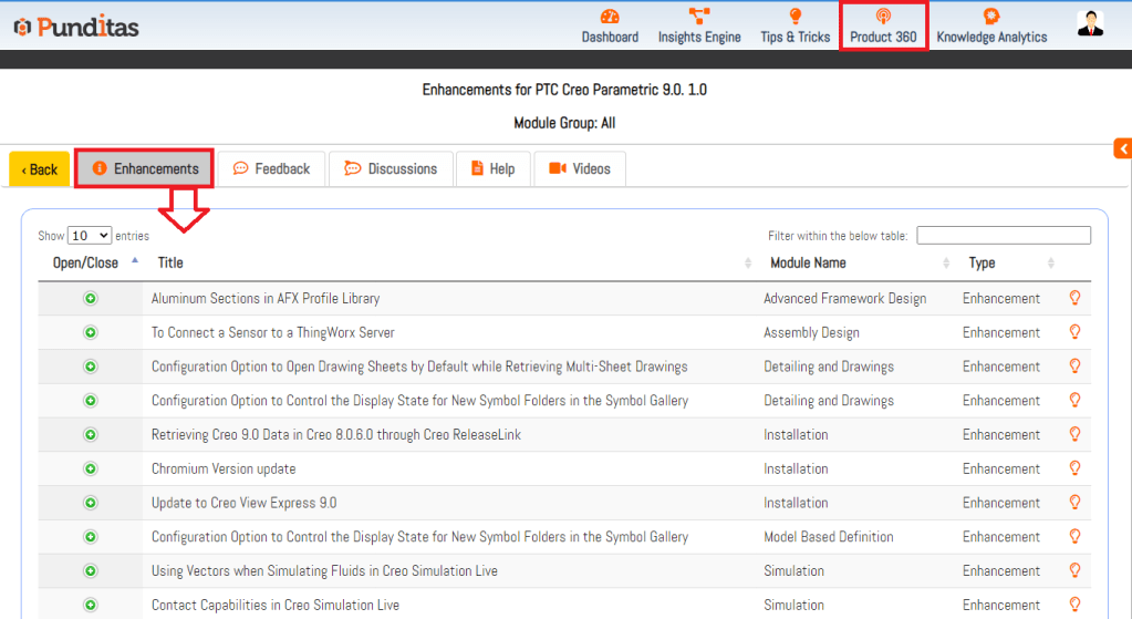 PTC released Creo 9.0.1.0 recently. Punditas AI Advisor now supports this latest version of Creo 9.0.1.0 . Punditas AI allows users to learn more about “How”, What” and “Why” of these enhancements through Product 360 module. The picture below shows the Module groups and the corresponding enhancements added within each group. To try this out, please signup for a FREE trial at Punditas AI