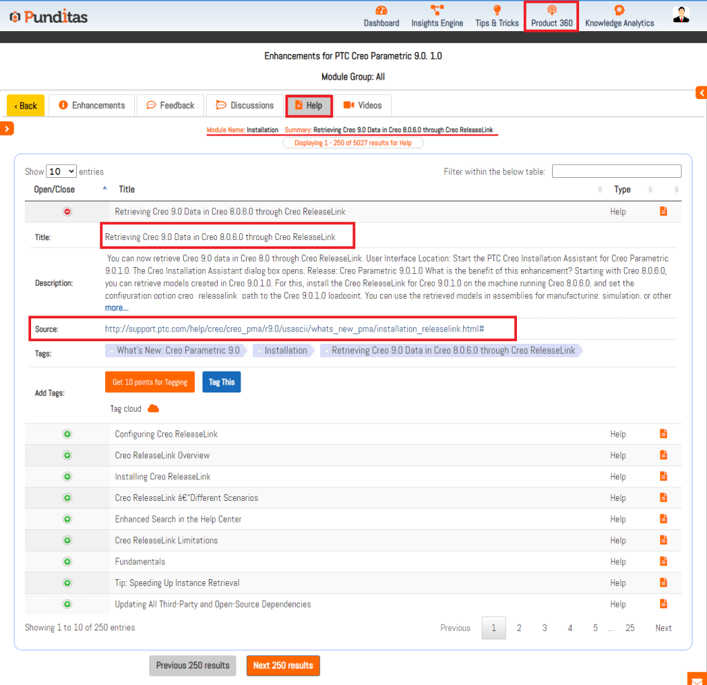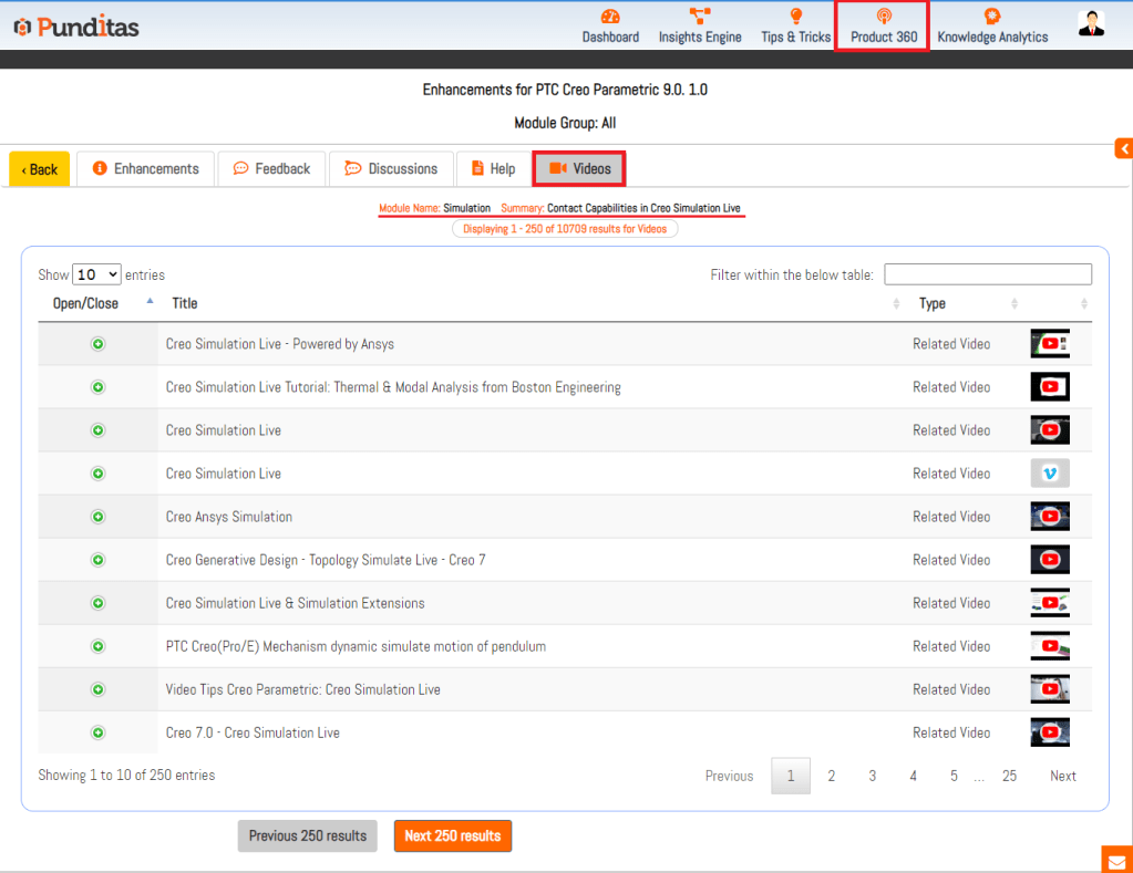 The Detailed View option in Punditas AI allows Creo Users to explore each enhancement in greater detail. The picture below shows the details of every enhancement in Creo 9.0.1.0. Not only is the list of enhancements displayed but also the associated Video tutorials, Online Help documentation (provided by PTC) as well as community discussions around this topic.