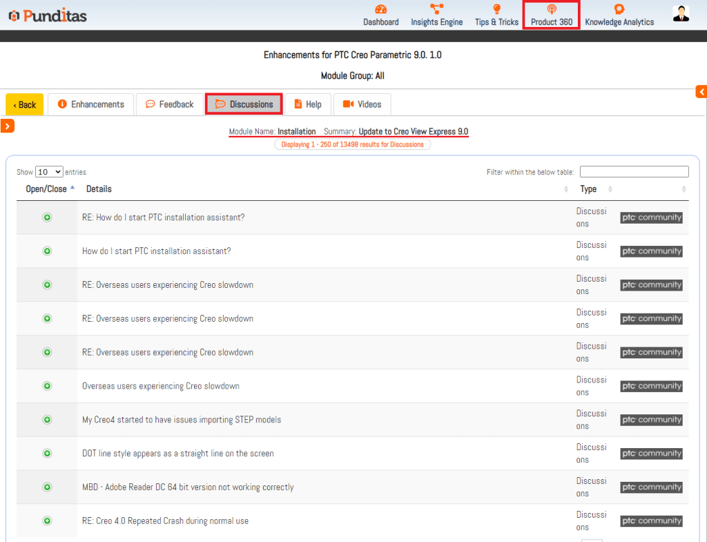 Punditas AI Advisor is a powerful platform as Users can access a single source of community chatter (discussions, opinions, suggestions) from both PTC and non-PTC sources. The image below shows discussions from PTC community related to “Installation” enhancement in Creo 9.0.1.0