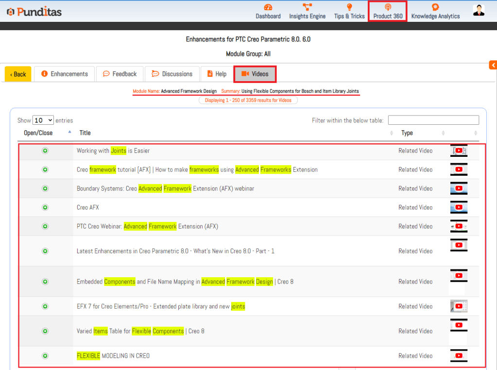 Punditas AI Advisor also offers Video Tutorials for every enhancement to help Users learn how to use the feature in Creo Parametric software. The image below shows the related videos for “Advanced Framework Design” that has been updated in Creo 8.0.6.0. These Videos are extracted and curated by Punditas AI engine from 10’s of repositories including PTC’s Learning Connector, YouTube, Vimeo, etc.