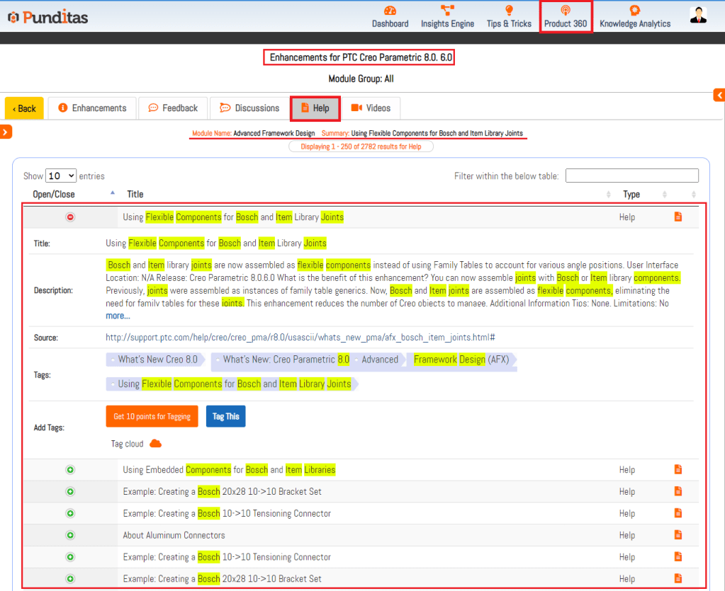 The Detailed View option in Punditas AI allows Creo Users to explore each enhancement in greater detail. The picture below shows the details of every enhancement in Creo 8.0.6.0. Not only is the list of enhancements displayed but also the associated Video tutorials, Online Help documentation (provided by PTC) as well as community discussions around this topic