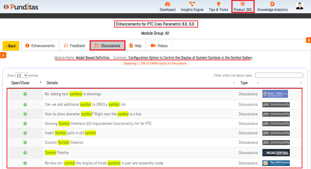 Punditas AI Advisor is a powerful platform as Users can access a single source of community chatter (discussions, opinions, suggestions) from both PTC and non-PTC sources. The image below shows discussions from PTC community related to “Model based Definition” enhancement in Creo 8.0.6.0