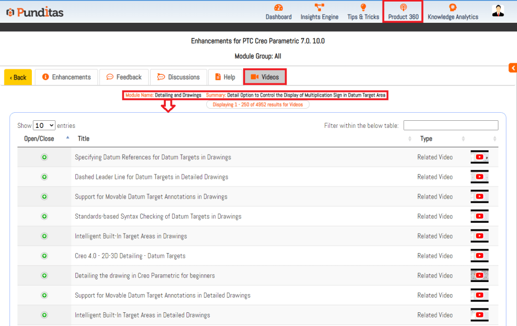Punditas AI Advisor also offers Video Tutorials for every enhancement to help Users learn how to use the feature in Creo Parametric software. The image below shows the related videos for “Detailing and Drawings” that has been updated in Creo 7.0.10.0 These Videos are extracted and curated by Punditas AI engine from 10’s of repositories including PTC’s Learning Connector, YouTube, Vimeo, etc.