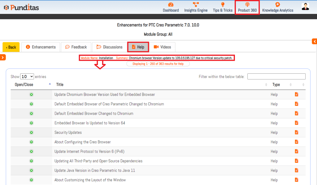 The Detailed View option in Punditas AI allows Creo Users to explore each enhancement in greater detail. The picture below shows the details of every enhancement in Creo 7.0.10.0. Not only is the list of enhancements displayed but also the associated Video tutorials, Online Help documentation (provided by PTC) as well as community discussions around this topic.