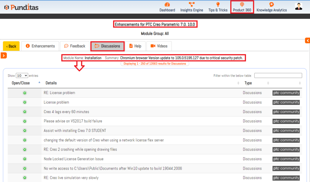 Punditas AI Advisor is a powerful platform as Users can access a single source of community chatter (discussions, opinions, suggestions) from both PTC and non-PTC sources. The image below shows discussions from PTC community related to “Installation” enhancement in Creo 7.0.10.0