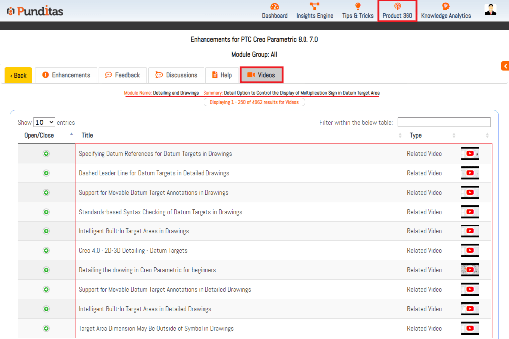 The Detailed View option in Punditas AI allows Creo Users to explore each enhancement in greater detail. The picture below shows the details of every enhancement in Creo 8.0.7.0. Not only is the list of enhancements displayed but also the associated Video tutorials, Online Help documentation (provided by PTC) as well as community discussions around this topic