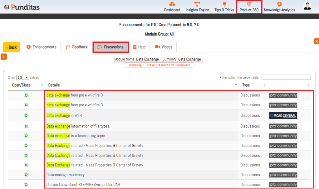 Punditas AI Advisor is a powerful platform as Users can access a single source of community chatter (discussions, opinions, suggestions) from both PTC and non-PTC sources. The image below shows discussions from PTC community related to “Data Exchange” enhancement in Creo 8.0.7.0