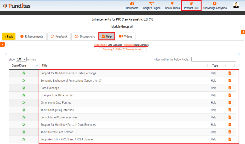 Punditas AI Advisor displays Help documentation for every enhancement as described by PTC in their Online Help. The image below shows Help articles that are relevant to “Data Exchange” enhancement added to Creo 8.0.7.0