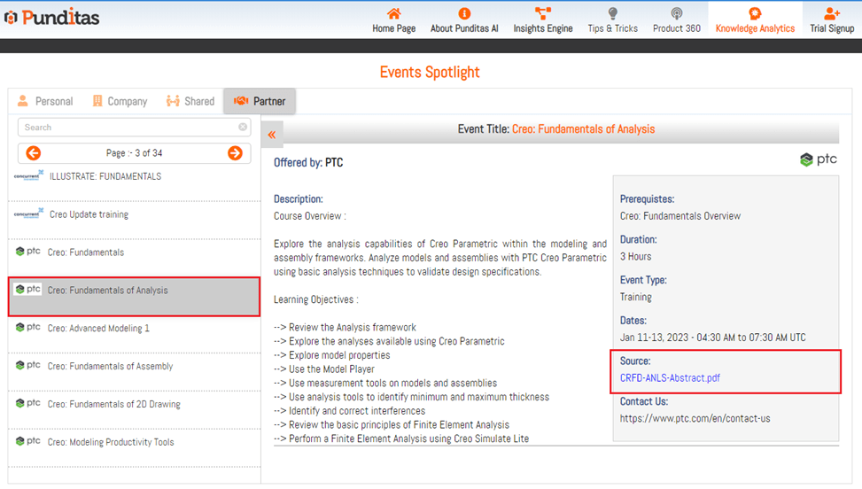 Punditas AI engine automatically discovers all Creo related webinars, trainings, events from PTC and the PTC partners. Punditas AI serves as your one-stop-shop for all Creo happenings. These events can be accessed from within the embedded browser in Creo application. To register for any of the upcoming events, go to the Events Spotlight tile on Punditas landing page and follow the below steps