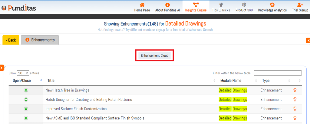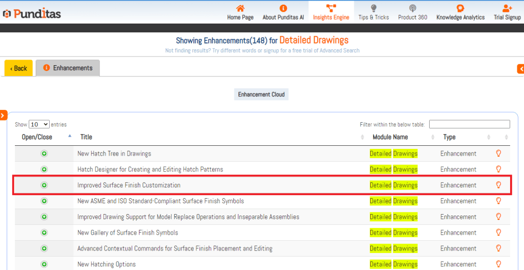 Punditas AI displays the comprehensive list of improvements, new features and capabilities related to Creo Parametric or many other Enterprise Softwares. As an example, searching for “Detailed Drawings” displays all the available enhancements in the Punditas Knowledge Graph as shown below.