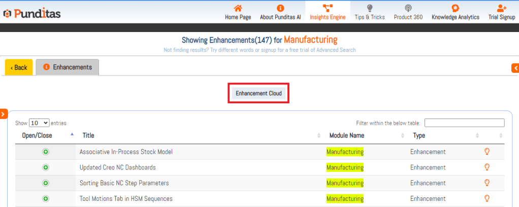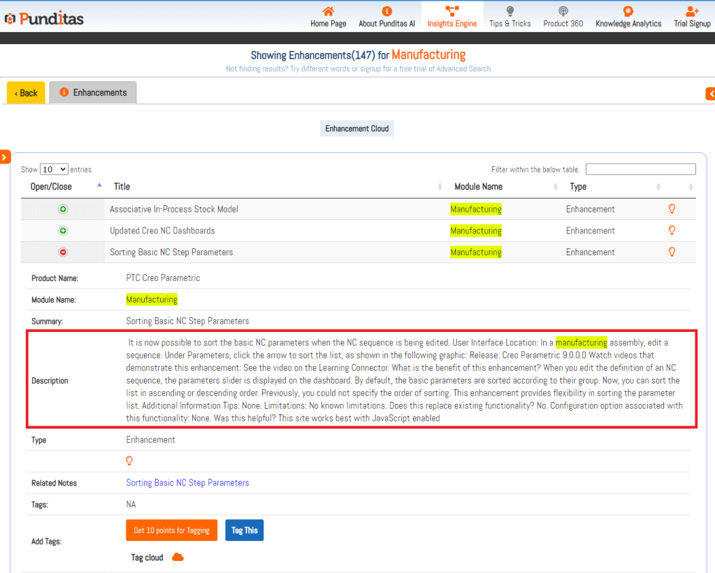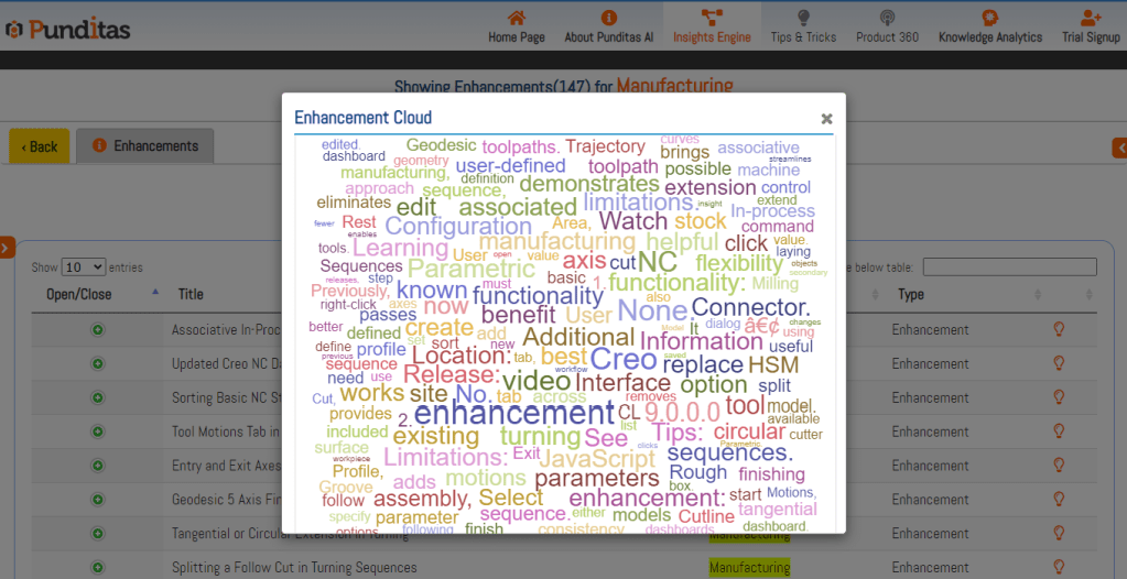 Punditas AI displays the comprehensive list of improvements, new features and capabilities related to Creo Parametric or many other Enterprise Softwares. As an example, searching for “Manufacturing” displays all the available enhancements in the Punditas Knowledge Graph as shown below.
