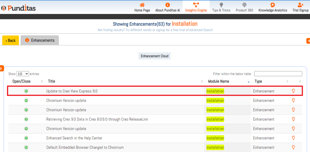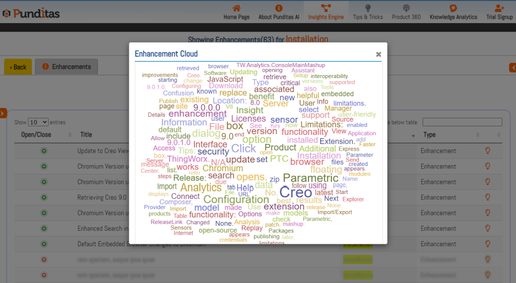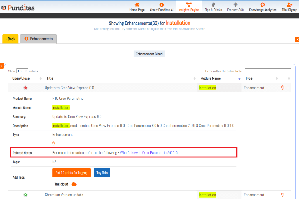 Punditas AI displays the comprehensive list of improvements, new features and capabilities related to Creo Parametric or many other Enterprise Softwares. As an example, searching for “Installation” displays all the available enhancements in the Punditas Knowledge Graph as shown below.