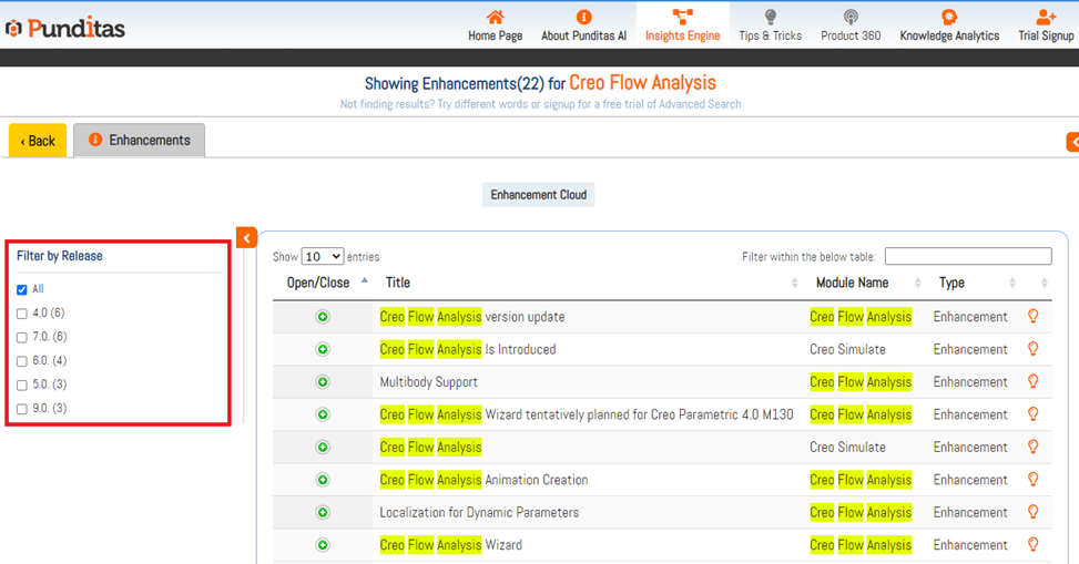 Enhancements node in Punditas AI contains All the latest improvements, information about new features and capabilities related to Creo Parametric. In the Enhancements node, information is provided from the earliest version of Creo to the most recent version. Using Filter feature inside the node you can see enhancements based on the Creo Releases.