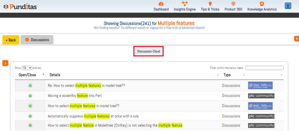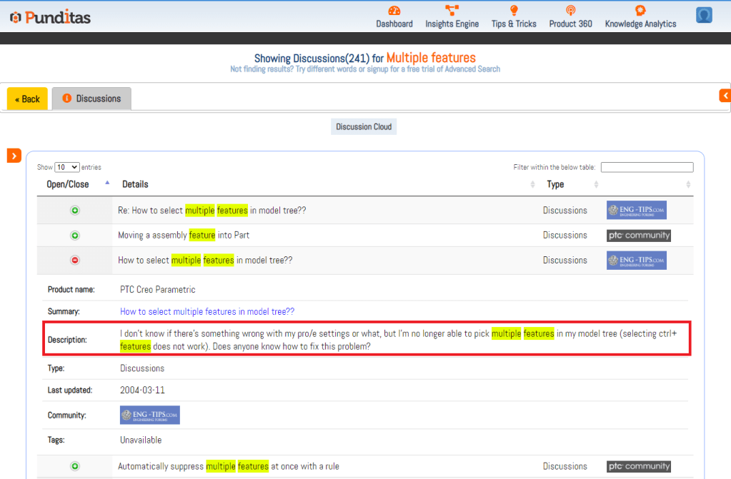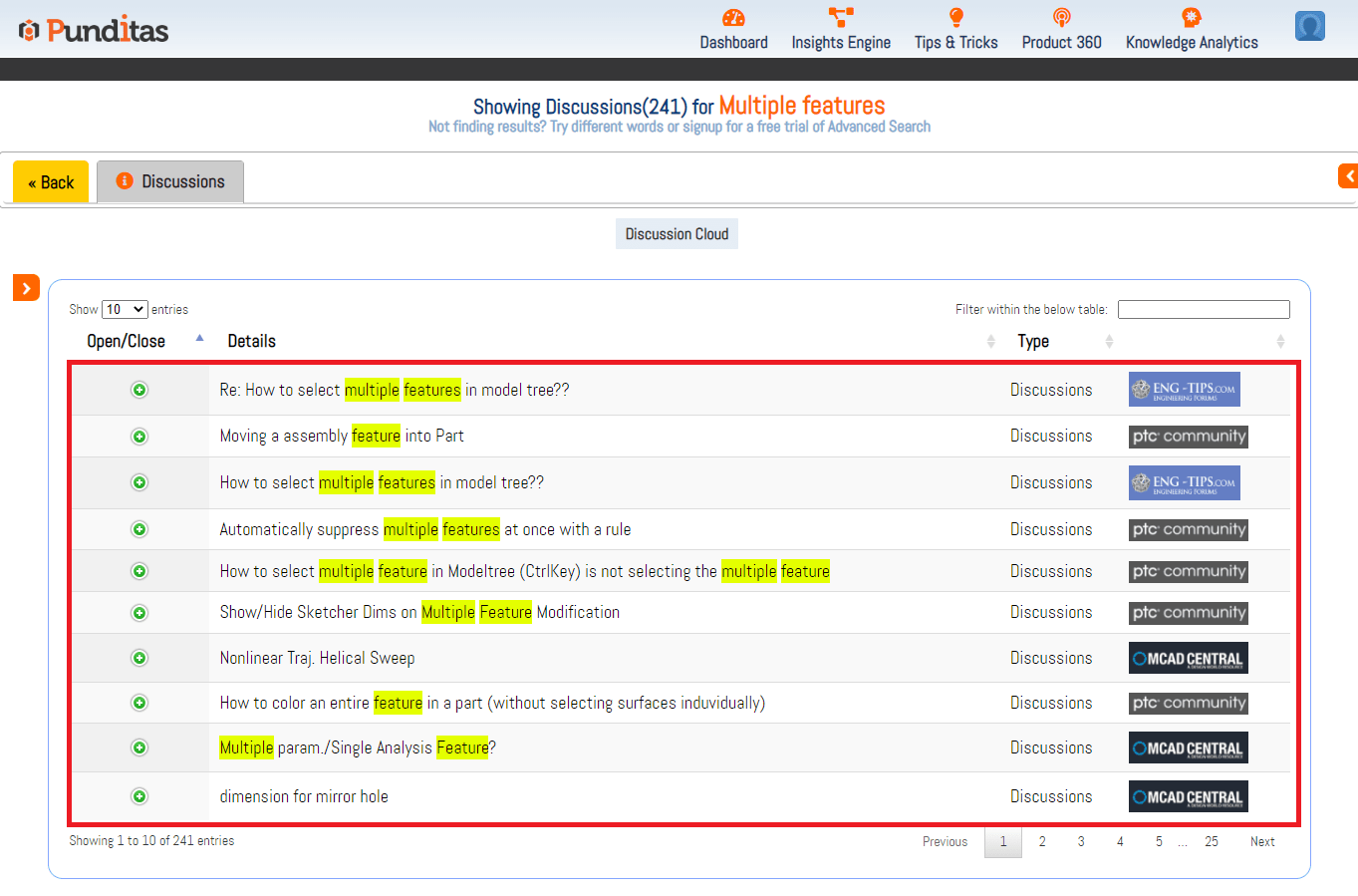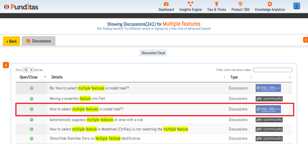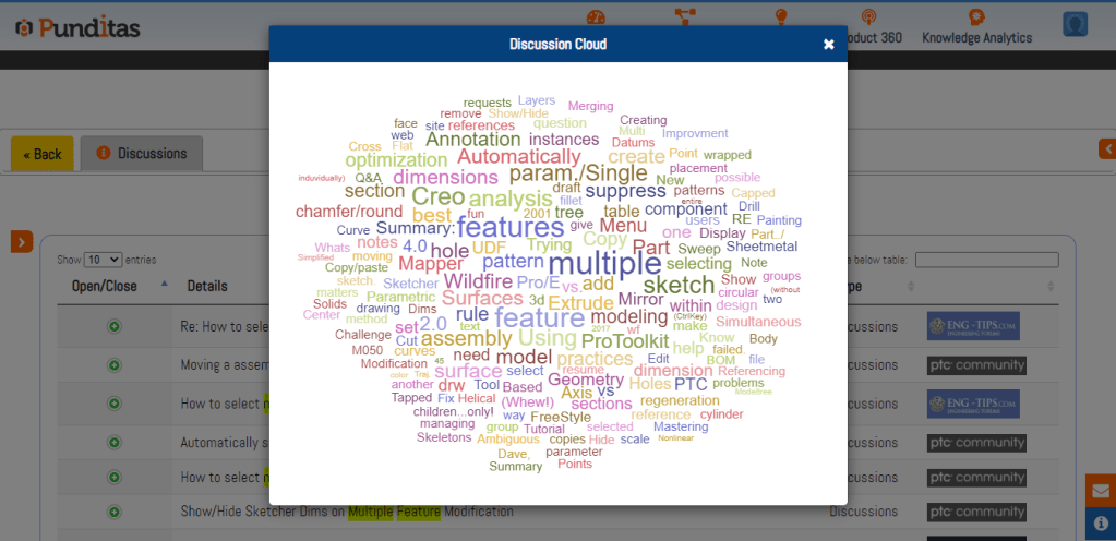 Punditas AI collects discussions from forums like “PTC Community” , “MCAD Central” , “3DCAD Forum” , “PTC User Org” , “Eng-Tips” , “The CAD Forums” , “GrabCAD Community” , “Engineers Edge” etc. and displays in Discussions node based on the given search input