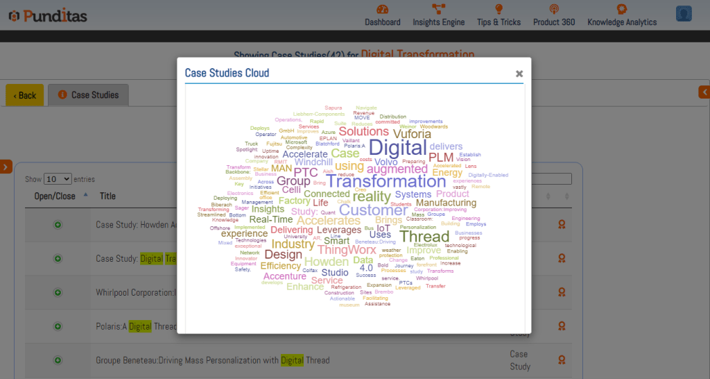 Step 2 :- Case Studies Cloud option is a visual representation of the words associated with the search topic. The font size of a word indicates how often the “word” occurs in the Title, descriptions, and tags within our database, while smaller font size indicates decreased availability of results for that search topic