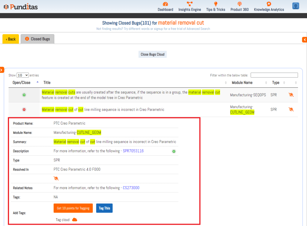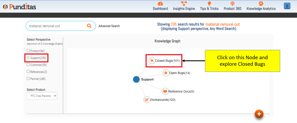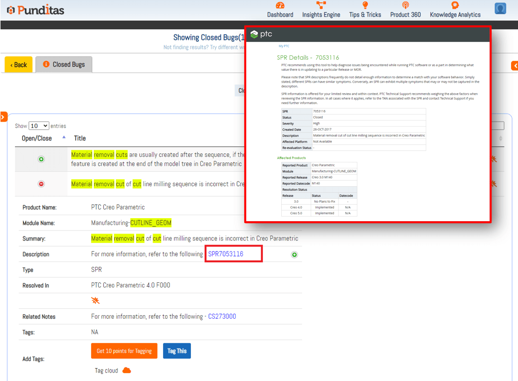 Step 1 :- Search for the Creo topic regarding issue or SPR number, select Support perspective and click on Closed Bugs node as displayed below in the image and find out all the relevant closed issue regarding searched topic (Here material removal cut)