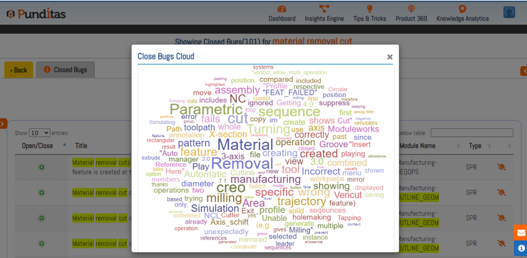 Step 2 :- Closed Bugs Cloud option is a visual representation of the words associated with the search topic. The font size of a word indicates how often the “word” occurs in the Title, descriptions, and tags within our database, while smaller font size indicates decreased availability of results for that search topic
