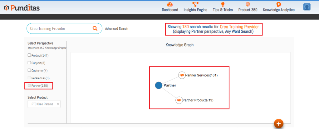 Step 5:- Explore each node available in Partner Perspective, Following Image displays Knowledge graph in Partner Perspective for Creo Parametric topic Creo Training Provider. Partner Perspective is showing total 180 search results where 19 Partner Products and 161 Partner Services are available