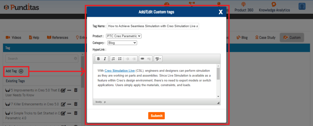 But what if users want to create their own content and share it with others? That’s where Punditas AI’s “Add Tags” feature comes in. By allowing users to add their own content, hyperlinks, and thumbnails, Punditas AI enables users to create and share their own curated collections of essential PTC Creo Parametric information