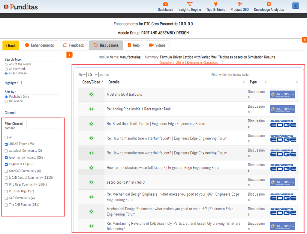 By using Punditas AI‘s Filter feature in the Product 360 module, you can quickly and easily navigate through popular community platforms such as PTC Community, EACPDS, 3DCAD Forum, Eng-Tips, GrabCAD, Engineers Edge, MCAD Central, PTC User Org, and more. The Filter feature allows you to search for discussions on specific Creo Parametric modules, saving you time and effort in your research.