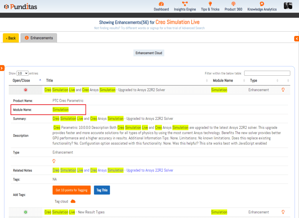With Punditas AI, users are empowered to swiftly identify the enhanced areas of Creo that directly impact their work. Through the Module names, a comprehensive representation of specific features, functionalities, and performance aspects, users can effortlessly navigate the landscape of improvements. By simply checking the Module names, users gain immediate insights into the areas that have undergone changes, allowing them to gauge the potential effects on their workflows and usage of PTC Creo Parametric.