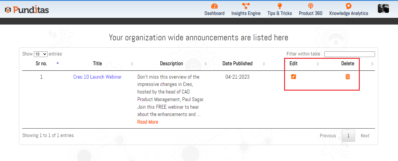 The Announcements tile functions as a dedicated channel for delivering time-sensitive and relevant messages to users within a specific company. By setting expiration dates for each announcement, Admin users can ensure that only the most current and pertinent information is displayed. For instance, if there is an upcoming downtime scheduled for the Creo software, the Admin user can create an announcement with the relevant details and specify the expiration date to ensure that it is visible to users until the downtime has passed. Similarly, when an upgrade to the Creo version is planned, the Admin user can promptly add this announcement to the tile, allowing users to stay informed about the upcoming changes.