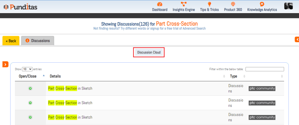 Moreover, the Discussion Cloud is constantly updated, ensuring that the information provided is always up-to-date and reflective of the latest conversations happening in the online forums. As new discussions emerge and evolve, the Discussion Cloud adapts accordingly, providing users with real-time insights into the current trends and developments surrounding their selected product (For example:- Creo Parametric).