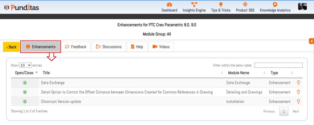 The Detailed View option in Punditas AI allows Creo Users to explore each enhancement in greater detail. The picture below shows the details of every enhancement in Creo 8.0.9.0. Not only is the list of enhancements displayed but also the associated Video tutorials, Online Help documentation (provided by PTC) as well as community discussions around this topic